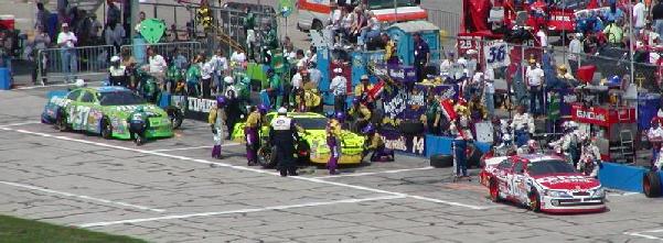 There's nothing quite like the smell of rubber on a beautiful Alabama spring day. These are a few pictures from the Talladega spring race in 2002. First there was Happy Hour for the Winston Cup cars, including eventual winner Dale Earnhardt Jr. Afterwards, the Busch cars ran, going two and three wide at 180 mph, before a huge wreck knocked more than half the field out of competition not a full 15 laps into the event. The few cars that remained relied on quick pitstops to put them in contention for a trip to victory lane.