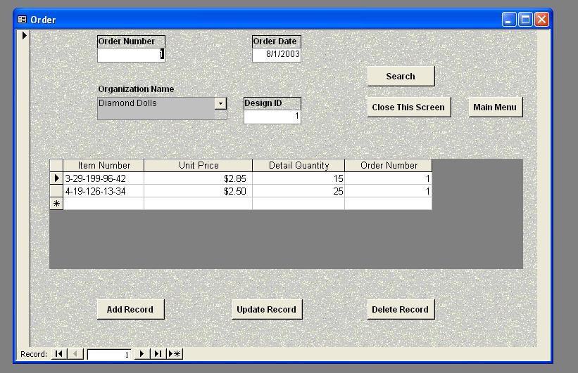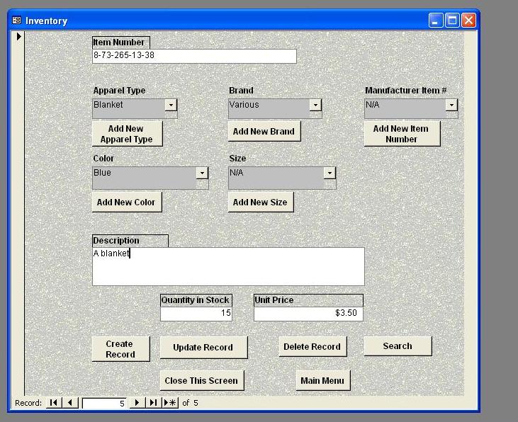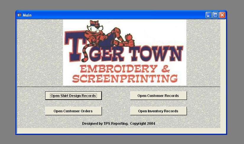 The business selected was TigerTown Embroidery and Screen Printing, a company that does most of its business by creating custom tee shirts for Auburn area organizations. At the time of our initial contact with TigerTown, inventory was done strictly by hand, counting the number of blank shirts, caps, etc and keeping track of the numbers on each box. Artwork was kept on Zipdisks, but there was no means or method of cataloging the images.