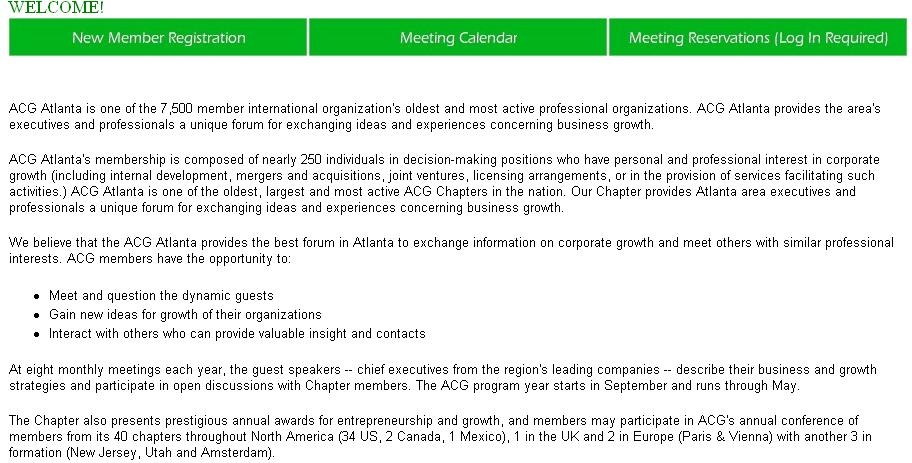 This project was the culmination of Management 4880, MIS Projects. The course was a synthesis of various skill sets. The class was a five week summer term class that culminated in a functioning, web based system that interacted with a database. Our team chose to create a system that would allow a membership based organization to collect meeting reservations from its members via the web. The system was also designed to allow new members to join the organization, as well as act as in information portal.